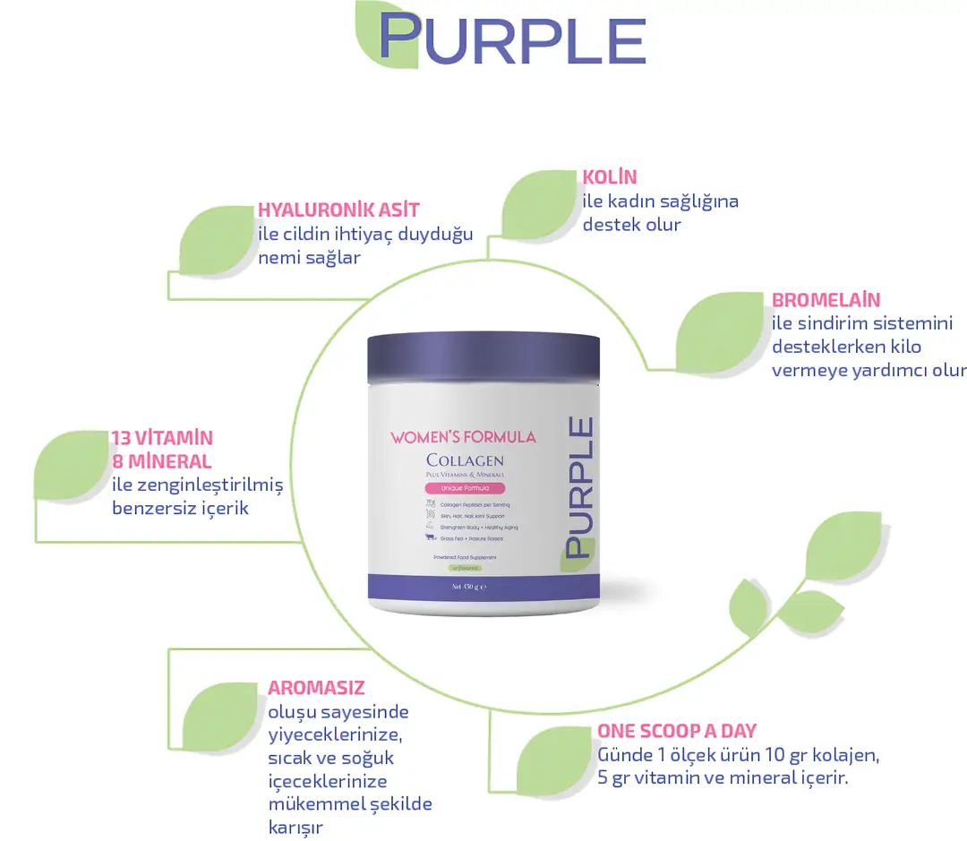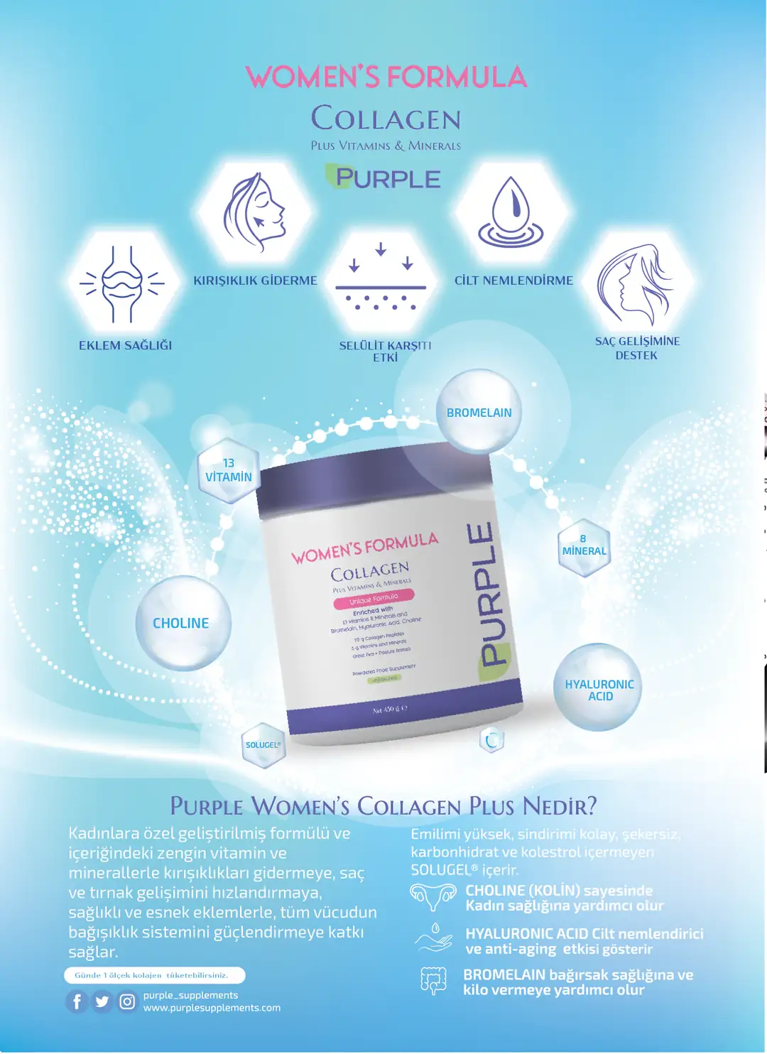 Türkiye’de ilk ve tek kadınlara özel geliştirilmiş formülüyle öne çıkan premium bir gıda takviyesidir. Grass-fed kaynaklı, 2000k Dalton kolajeni; 13 vitamin,8 mineral, Hyaluronik Asit,Bromelain ve Kolin ile birleşerek kadınların günlük ihtiyaçlarını destekler Cildin esnekliğini artırmaya, saç ve tırnakları güçlendirmeye ve genel olarak daha enerjik hissetmeye yardımcı olur. Kendine özen gösteren kadınlar için pratik ve keyifli bir günlük destek sunar.