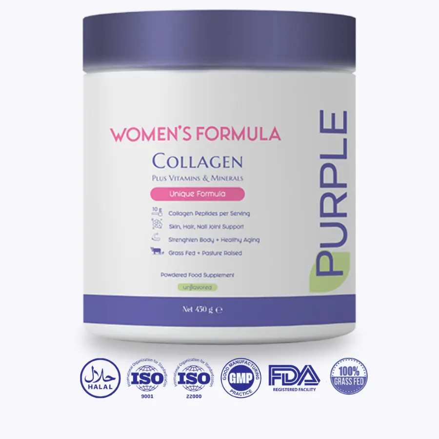 Eşsiz olan Purple Women's Formula Kolajen yalnızca bir kolajen değil, kadınların özellikle ihtiyaç duyduğu mineraller ve vitaminlerin bulunduğu benzersiz ve zengin bir formüldür. İçeriğindeki kolajenden gelen doğal amino asitlerin yanında 8 mineral ve 13 vitamin sayesinde vücudunuzdaki eksiklikleri tamamlamanıza yardımcı olurken, Bromelain, Hyaluronic Asit ve Choline gibi ekstra bileşenler de kadınların özel ihtiyaçlarına yönelik destek sağlar.